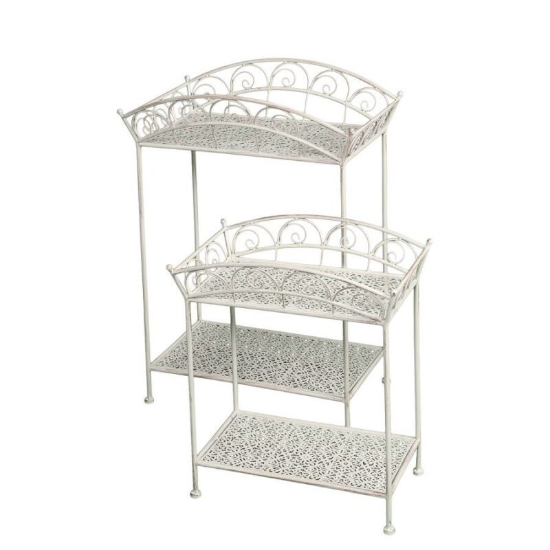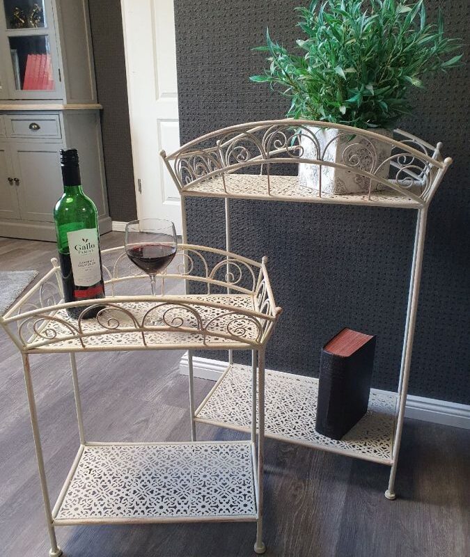 Tooge oma koju romantiline õhkkond nende hoolikalt valmistatud kahe sepistatud rauast abilauaga. Lauad näevad elegantsed välja nii lillelauana kui ka üldiseks kasutamiseks mõeldud abilauana. Tänu spetsiaalsele pulbervärvitud viimistlusele sobib see toode nii sise- kui ka välistingimustes kasutamiseks. Kreemjasvalge värv annab kergelt pruunika varjundi, mis annab nostalgilise ilme. Väike 55x45x29cm (iga riiul 37x20cm) Suur 79x54x36cm (iga riiul 46x25cm)