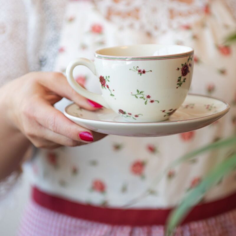 Valge romantilises stiilis punase lillemotiiviga kohvitass koos alustaldrikuga. Tassi mahutavus 200ml. Mõõdud: tass 11x9x7cm ja taldriku diameeter 15cm, kõrgus 2cm.