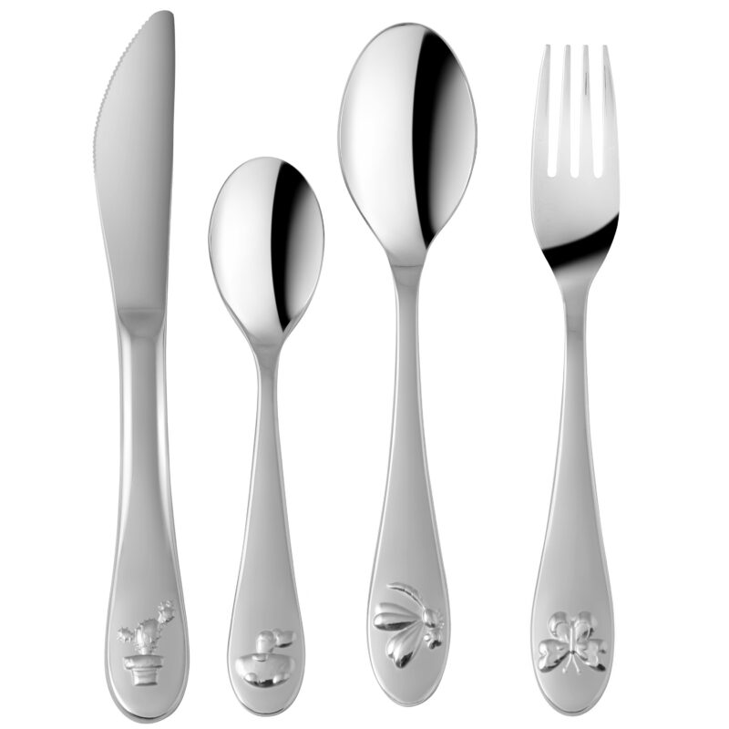 Komplekt sisaldab kahvlit, nuga, lusikat ja teelusikat ning iga käepidemel on lõbus reljeefmuster, mis muudab söögiajad iga väikelapse jaoks nauditavamaks. Lisaks hoolitsesime kõige olulisema eest, nimelt teie lapse turvalisuse eest. Sel põhjusel – vigastuste ohu minimeerimiseks – on noateral ainult üks sakiline serv, mis võimaldab liha või leiba lõigata.