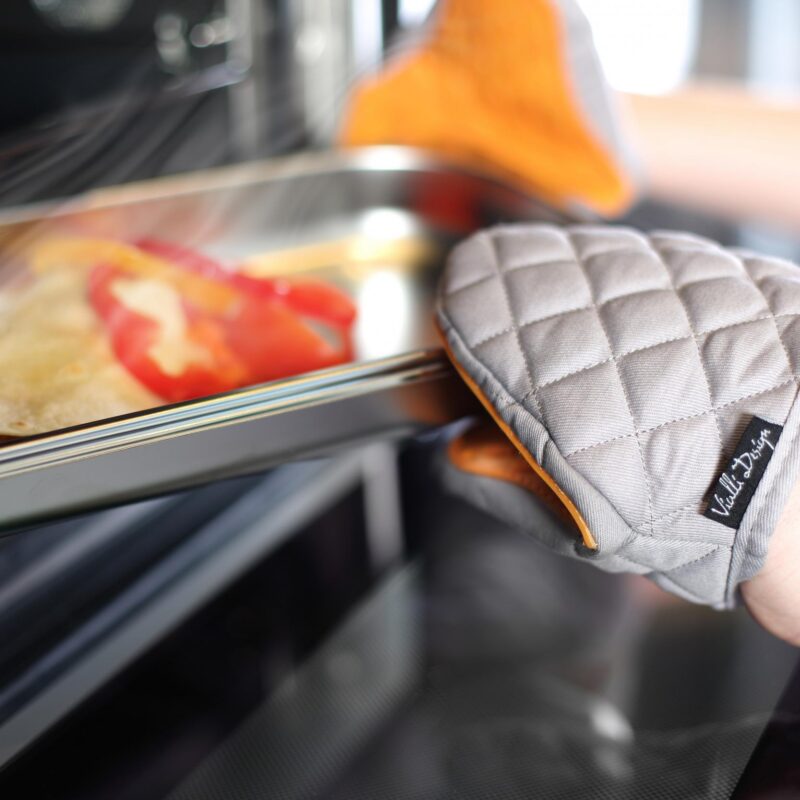 Vialli Designi käepärane ja lühike Livio ahjukinnas on valmistatud kõrgeima kvaliteediga materjalidest, 100% puuvillast, ja kinda sisemine osa on kaetud paksu silikoonkihiga, mis talub kuni 260 kraadi Celsiuse kraadi. Originaalne tepitud kinnas on iga köögi oluline aksessuaar – seda saab kiiresti kätte panna ja ära võtta. See tagab termilise ohutuse ja kaitse peopesa ja käeselja põletuste eest. Toote värviversioonid sobivad ideaalselt igasse köögiinterjööri ja näevad suurepärased välja köögikubudel, reelingutel või pliidi ääres rippudes.