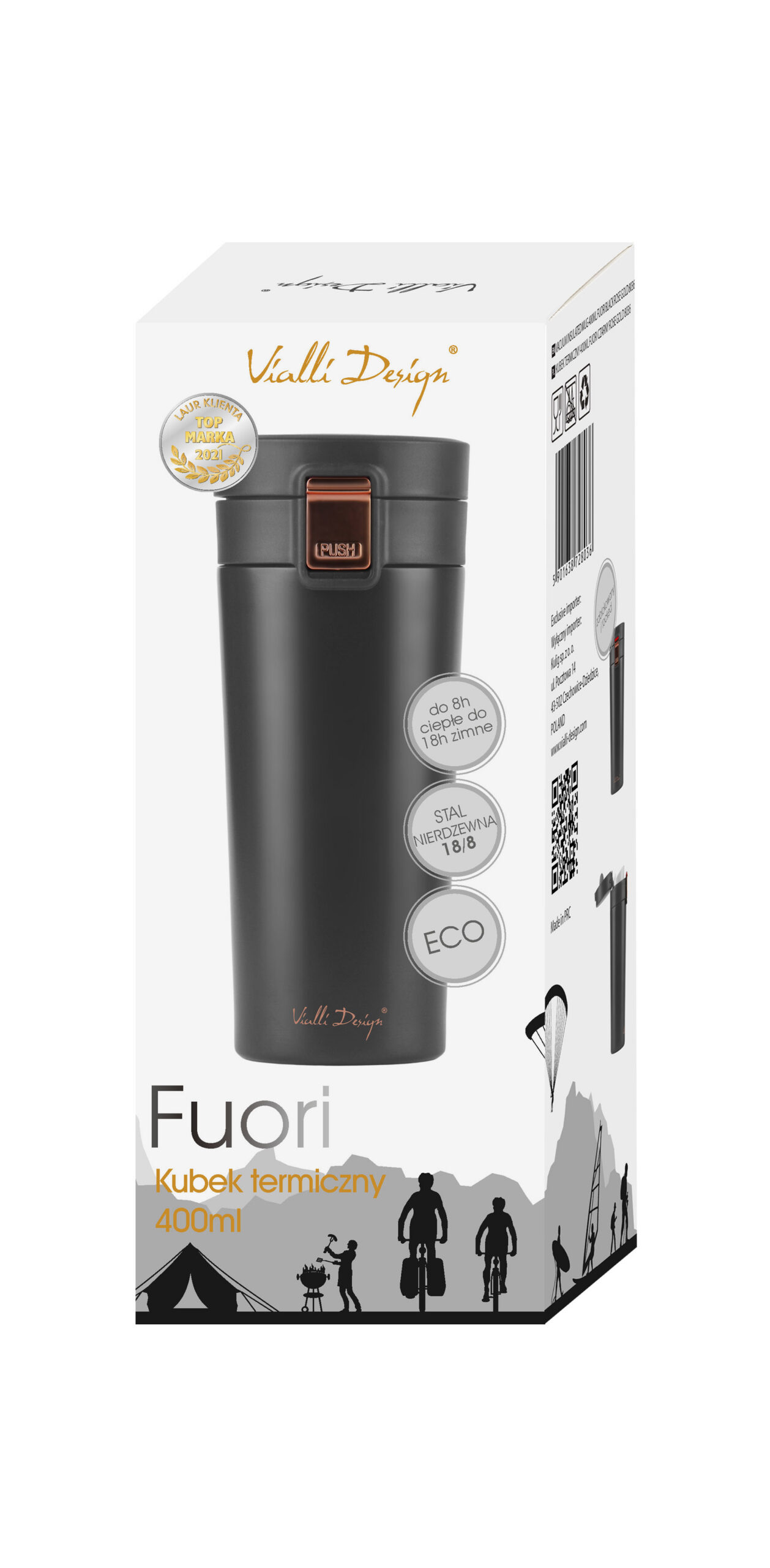 Fuori termokruus on 400 ml mahutavusega anum, mis sobib ideaalselt kohvi või tee hoidmiseks. See hoiab kuuma jooki kuumana 8 tundi, külmi jooke aga kuni 18 tundi. Kõik see on võimalik tänu terasest vaakumisolatsioonile. Termokruus on suurepärane aksessuaar jalutuskäikudeks ja pikkadeks reisideks – selle kasutamine on äärmiselt lihtne ja meeldiv. Lisaks on tänu kergele konstruktsioonile selle hoiustamine ja transportimine probleemivaba.