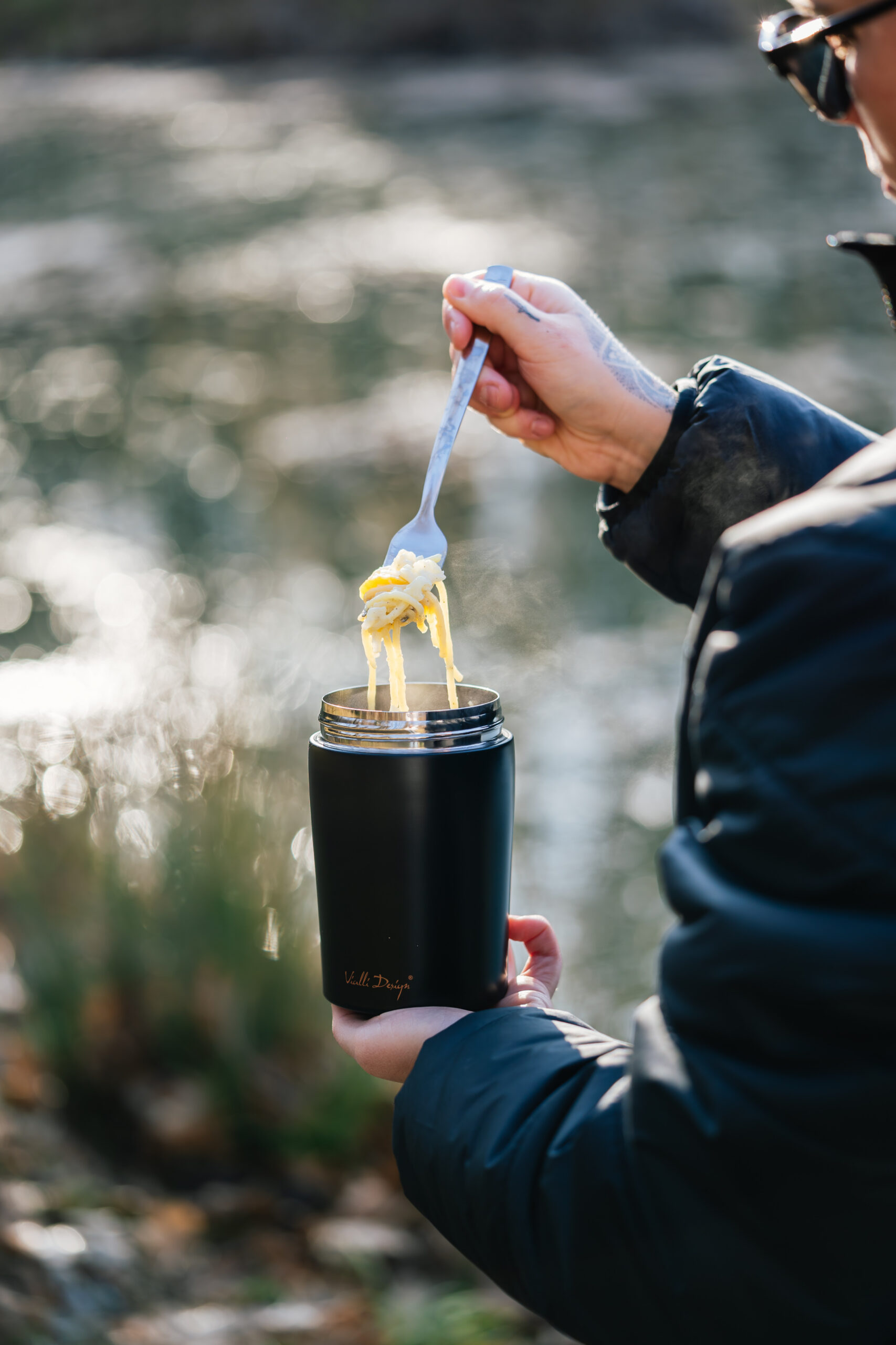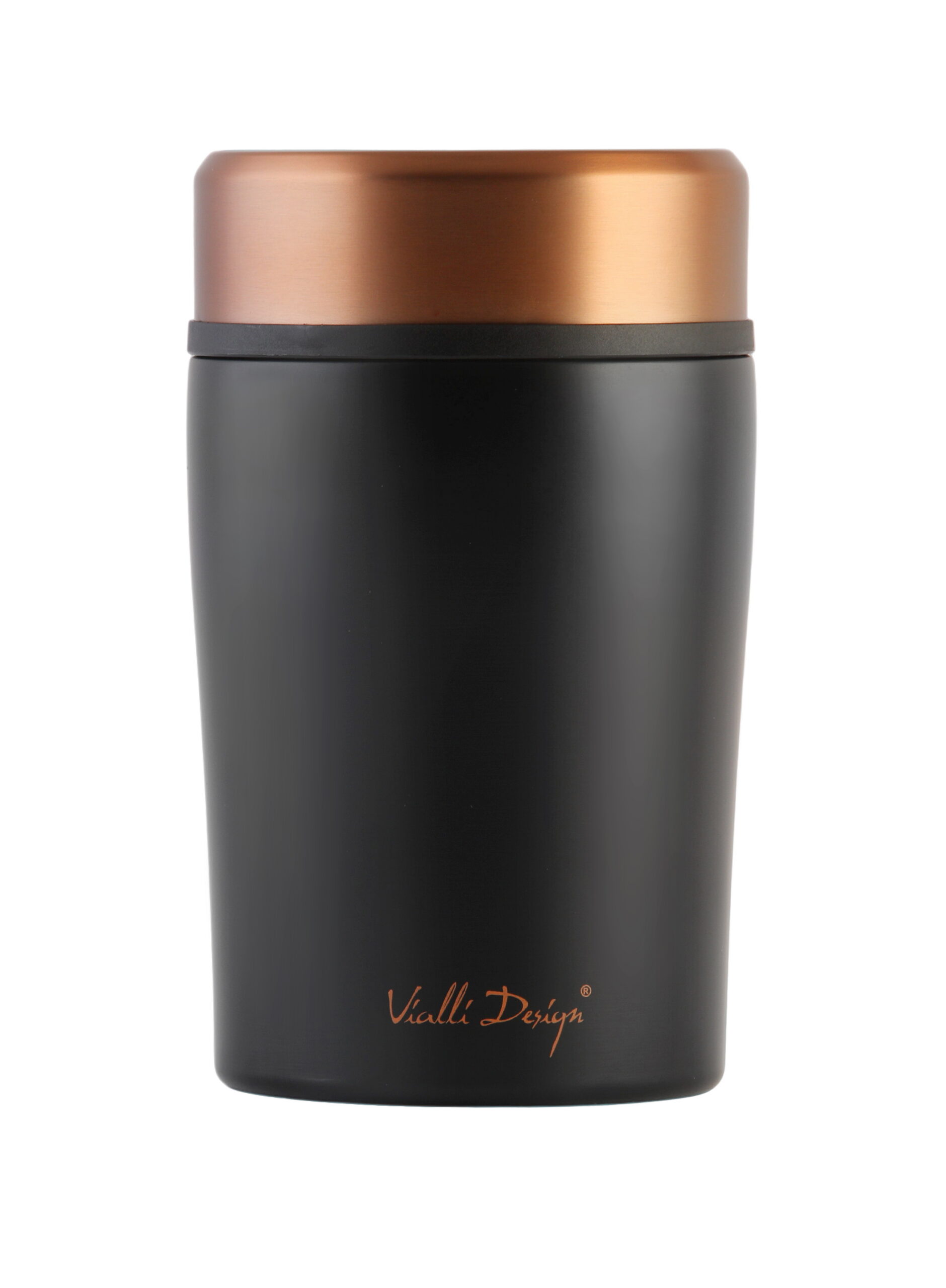 Vialli Design lõunatermos Fuori seeriast mahutab 500 ml ja on varustatud terasest vaakumisolatsiooniga – see tagab sobiva temperatuuri püsimise pikka aega. Kuumade toodete puhul on see 12 tundi ja jahutatud toodete puhul kuni 16 tundi. Väga suur eelis on see, et välissein ei kuumene ega kondenseeru. Toote läbimõeldud kuju, mis sobib ideaalselt igasse kätte, on veel üks aspekt, mis tõestab selle erakordset funktsionaalsust. Kompaktne suurus ja väike kaal muudavad termose transportimise lihtsaks – saate seda hõlpsalt näiteks tööle kaasa võtta.