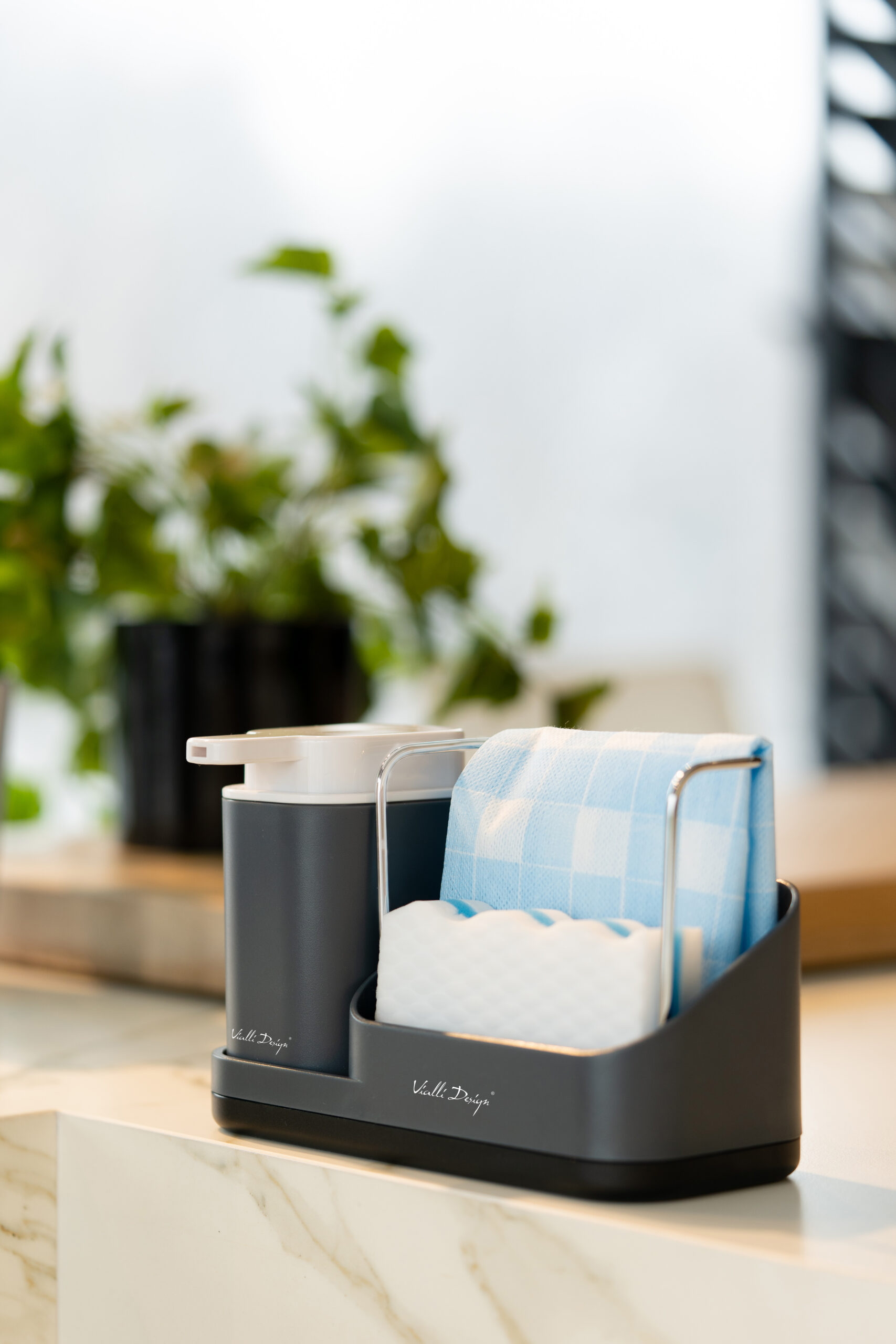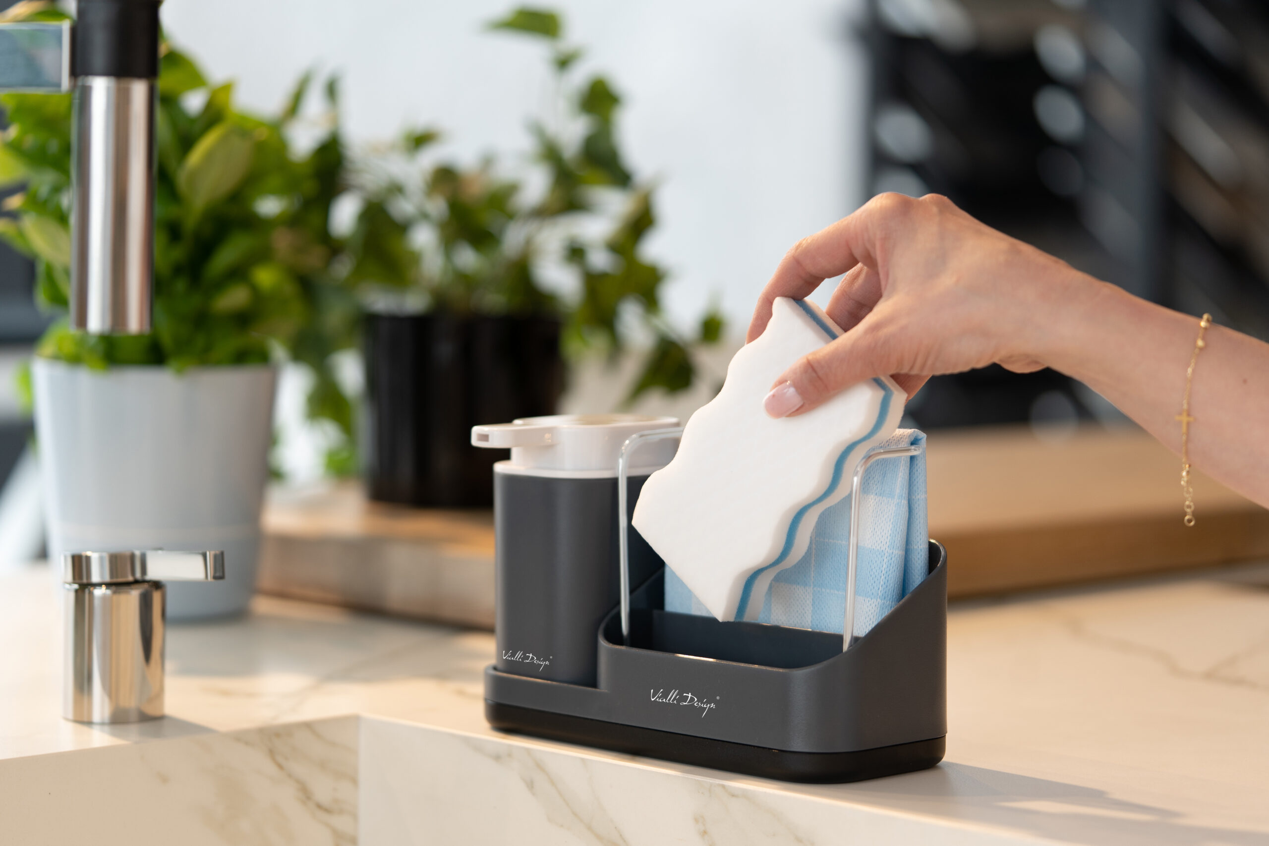 350 ml mahutavusega nõudepesuvahendi dosaator on ideaalne viis pesuvahendi mugavas ja elegantses kohas hoidmiseks. Alus laseb liigsel veel käsnast välja voolata, nii et te ei hoolitse mitte ainult funktsionaalsuse, vaid ka hügieeni eest. See on tõhus viis mikroorganismide, bakterite ja seente kasvu vähendamiseks. Vesi voolab köögikäsnast anumasse, mida saate regulaarselt tühjendada. Korraldaja on varustatud ka riidepuuga.