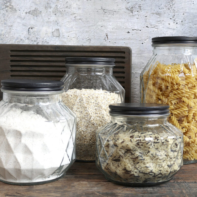 Klaasist kolmekorruseline hoiupurk kaanega. Sobib kööki erinevate väikeste snäkkide või maitseainete hoiustamiseks (pähklid, rosinad jne). Mõõdud 9x9x17cm.