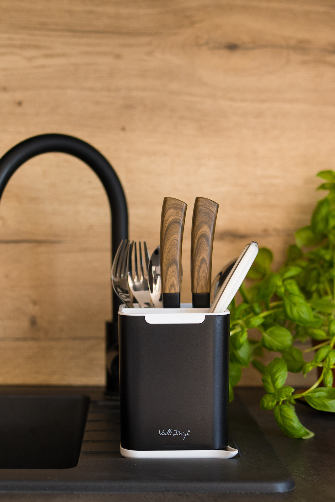Musta värvi Livio Duo söögiriistade kuivatusrest (mudel 25639) on praktiline ja stiilne köögitarvik, mis muudab pestud söögiriistade ja väikeste nõude kuivatamise lihtsaks. Funktsionaalne disain võimaldab kahvlite, lusikate, nugade ja spaatlite mugavat hoiustamist pärast pesemist ning esteetiline ja moodne disain sobib ideaalselt erinevatesse köögikorraldustesse.