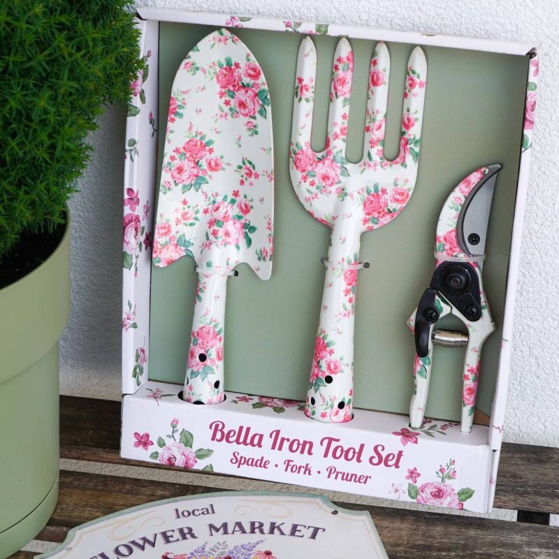 Too oma aiandusrutiini võlu ja funktsionaalsust Bella rauast tööriistakomplektiga. See kaunis lillemustriga trio on loodud nii stiilseks kui ka vastupidavaks ning sisaldab järgmist: