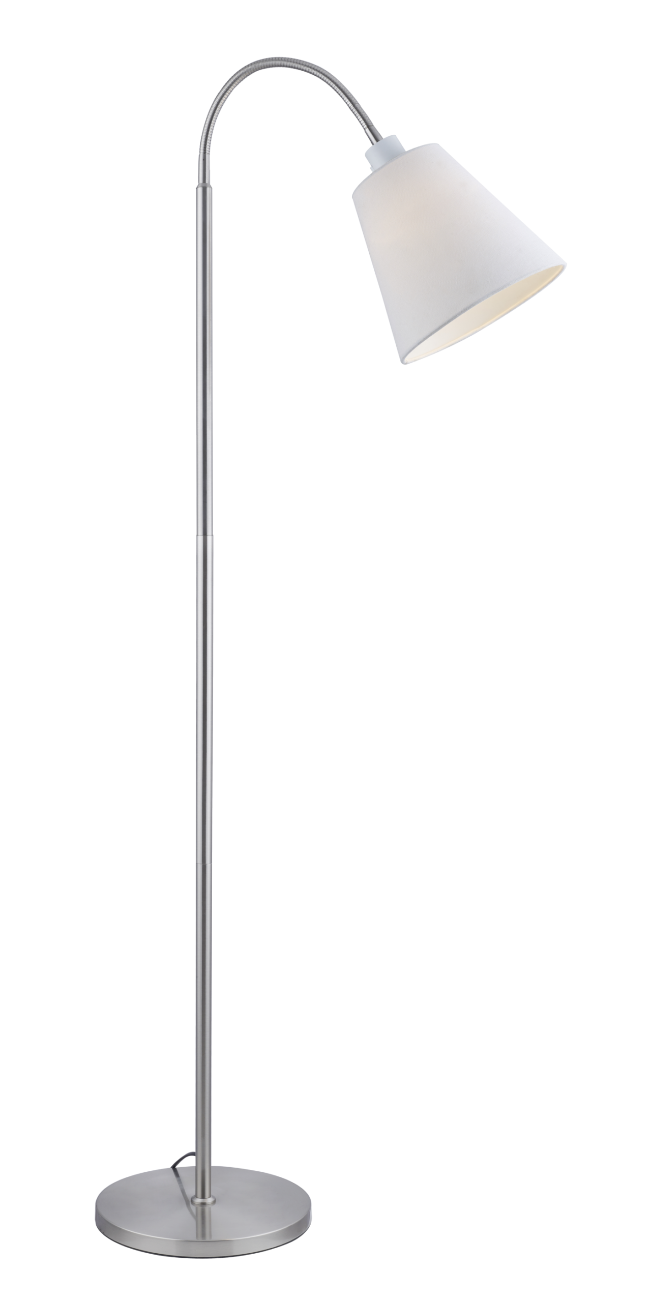 Valkja satiinist lambivarjuga põrandalamp, mis sobib hästi näiteks elutuppa tugitooli kõrvale. Lampi saab reguleerida vastavalt soovile, et tagada parim valgustus lugemiseks või käsitöö tegemiseks.