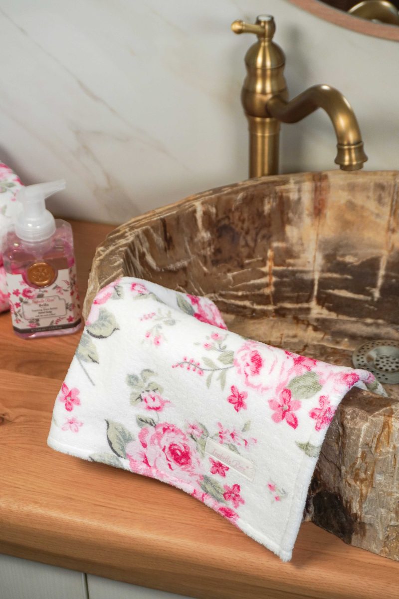 Imeilus roosa lillelise mustriga pehme rätik sarjast Bella. Saadaval kahes mõõdus: 30 × 50 cm ja 55 x 100cm. Materjal: 100% puuvill.