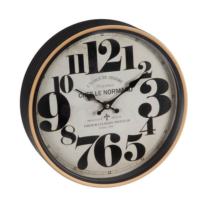 Metallist must kuldse äärega klassikaline ümmargune seinakell. Kellal suured numbrid seetõttu hea vaadata ka eemalt. Diameeter 29cm. Vajalik 1x AA patarei, ei kuulu komplekti.
