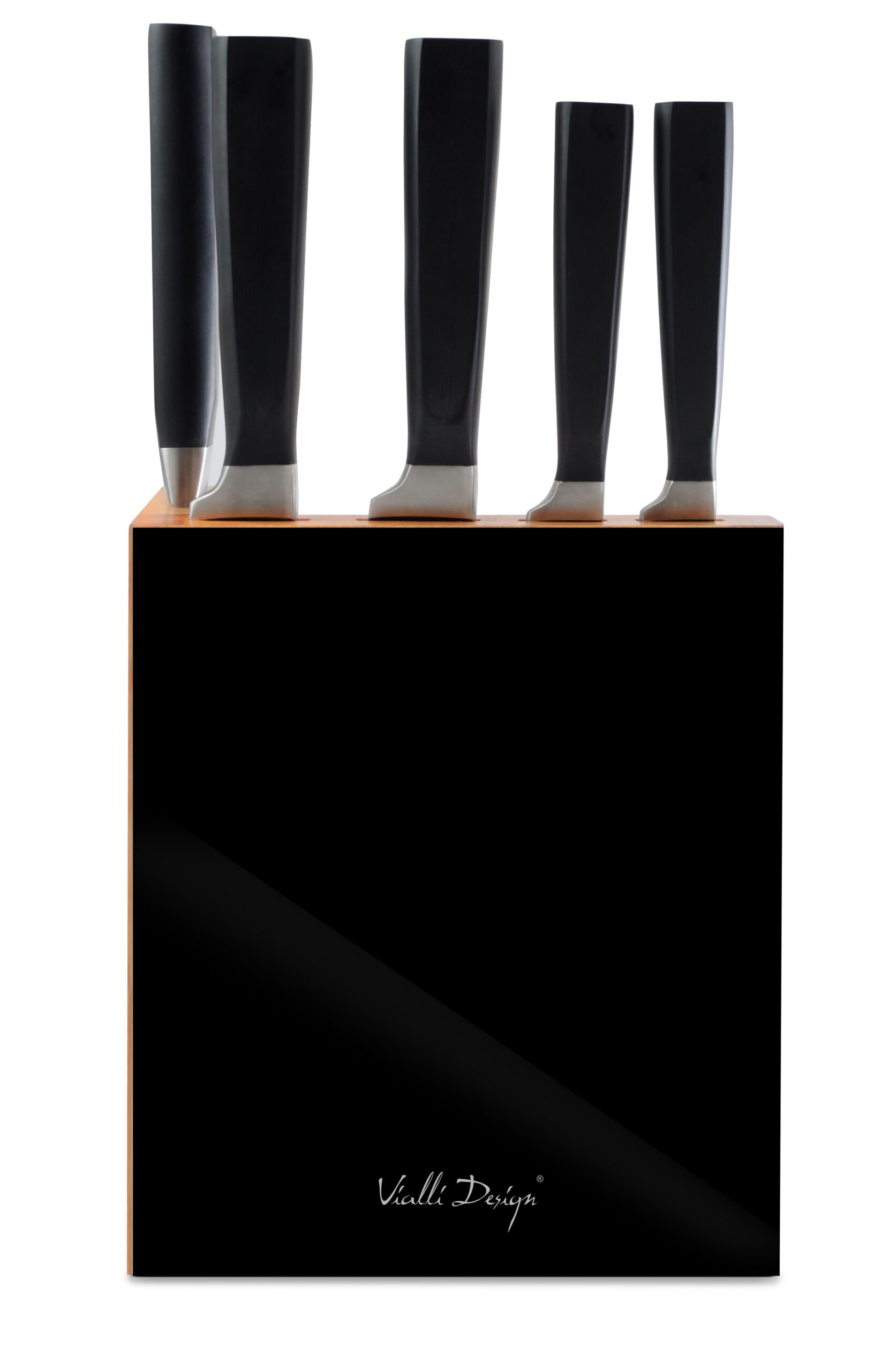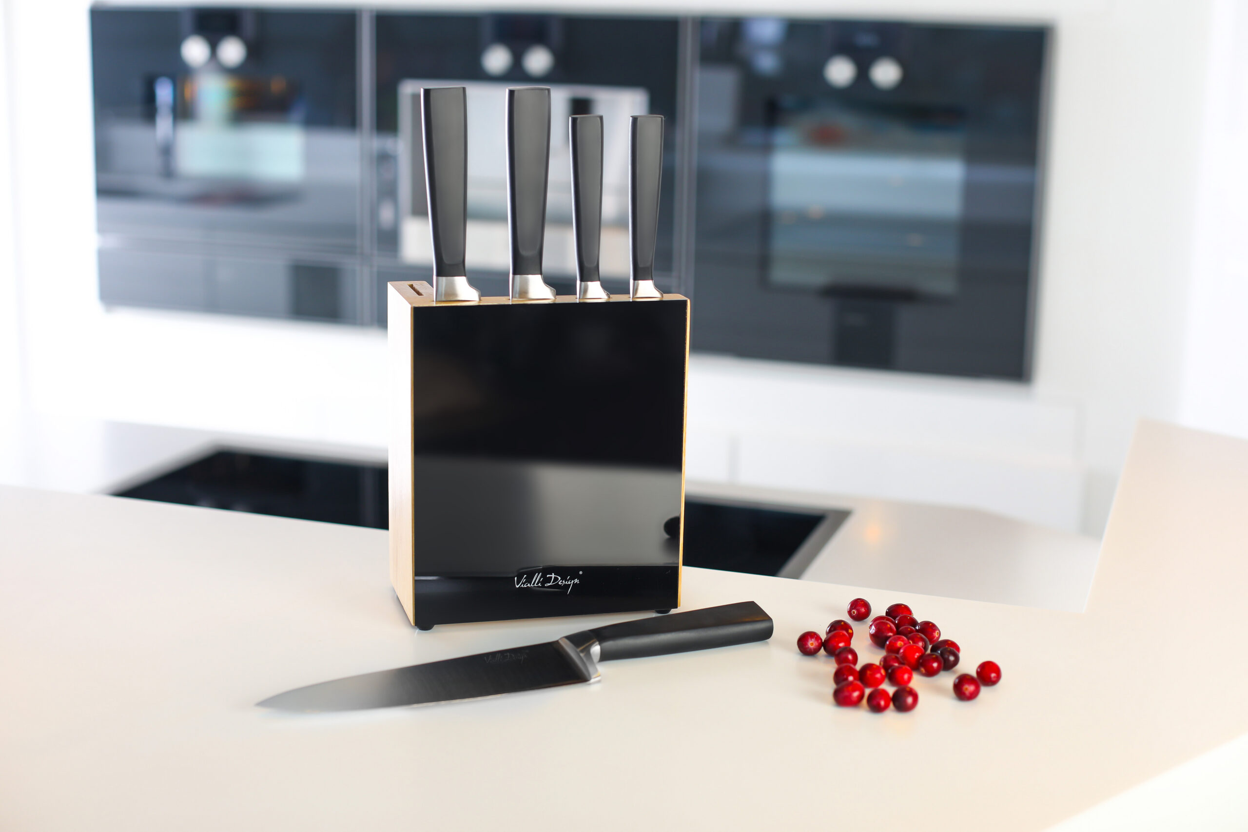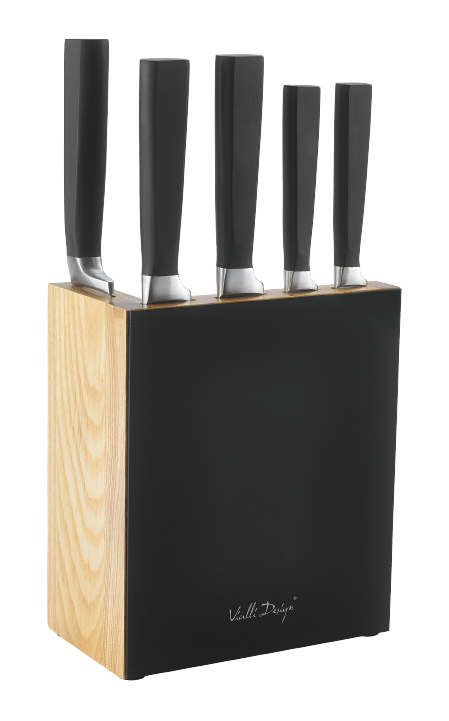 Moodne ja funktsionaalne FINO komplekt koosneb viiest sepistatud noast, mis on paigutatud elegantsesse puidust alusesse. Terad on valmistatud kvaliteetsest Saksa roostevabast terasest, mis tagab vastupidavuse, teravuse ja lõiketäpsuse. Saarepuidust alus musta akrüülkattega esipinnaga on stiilne ja praktiline täiendus igasse kööki.