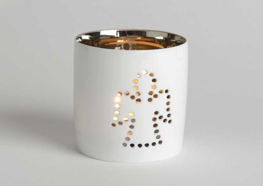 Valge portselanist teeküünlahoidja ingliga. Sisu kuldset värvi.