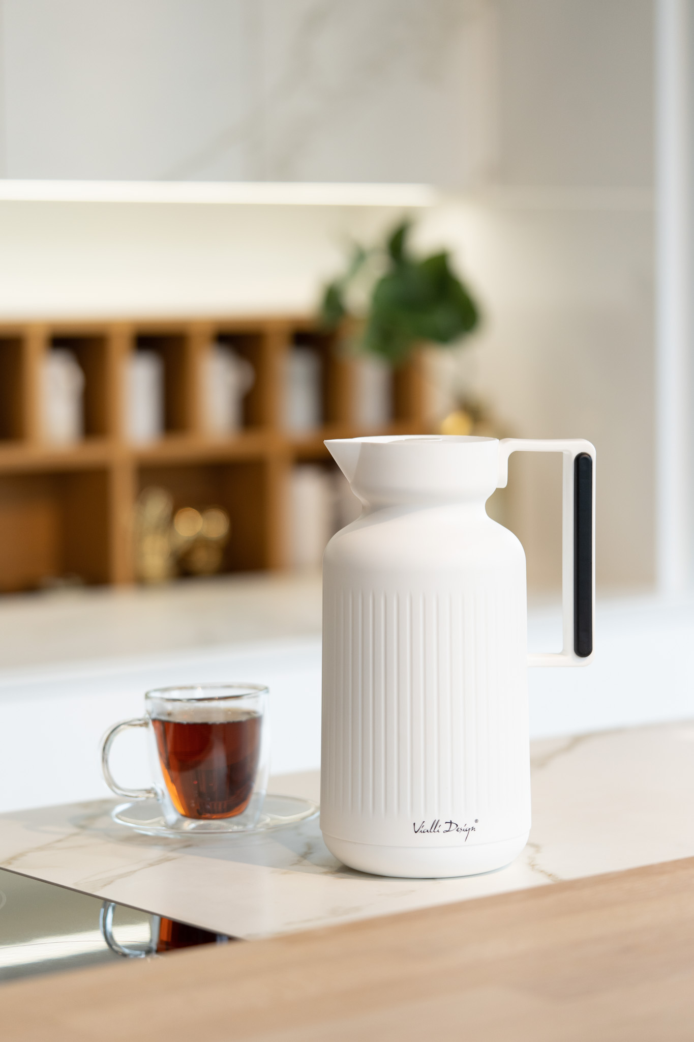 Vialli Designi Amo sarja funktsionaalne kann. Kõrgeima kvaliteediga borosilikaatklaasist valmistatud anuma topeltseinad mitte ainult ei hoia joogi sobivat temperatuuri kauem, vaid kaitsevad ka põletuste eest. Läbipaistvad seinad võimaldavad teil serveeritavat jooki, näiteks sidruni- ja mündilõikudega vett, mahlaga teed või värskendavat limonaadi, esitleda. Anumil on ergonoomiline kuju, mis hoiab ära selle käest libisemise.