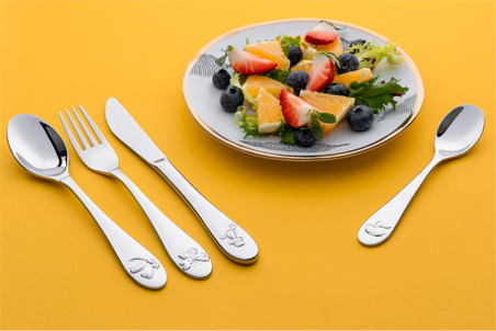 Komplekt sisaldab kahvlit, nuga, lusikat ja teelusikat ning iga käepidemel on lõbus reljeefmuster, mis muudab söögiajad iga väikelapse jaoks nauditavamaks. Lisaks hoolitsesime kõige olulisema eest, nimelt teie lapse turvalisuse eest. Sel põhjusel – vigastuste ohu minimeerimiseks – on noateral ainult üks sakiline serv, mis võimaldab liha või leiba lõigata.