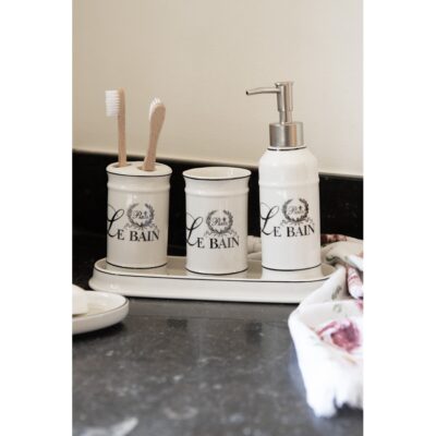 Keraamiline vannitoakomplekt ODETTE sarjast. See jäljendab marmormustrit ja sellel on õrnad hallid triibud. Domineeriv värv on valge. See sobib suurepäraselt kaasaegsesse hõbedase viimistlusega vannituppa. Pakitud aknakarpi, mille mõõdud: 21,5cm x 22cm x k8,5cm. Seebidosaatori mahutavus: 400ml, mõõdud h19cm x9,5cm, hambaharjatopsi mõõdud: 10,5cmx8cmx7,5cm, seebihoidja mõõdud: 13,5cmx11cmx2cm